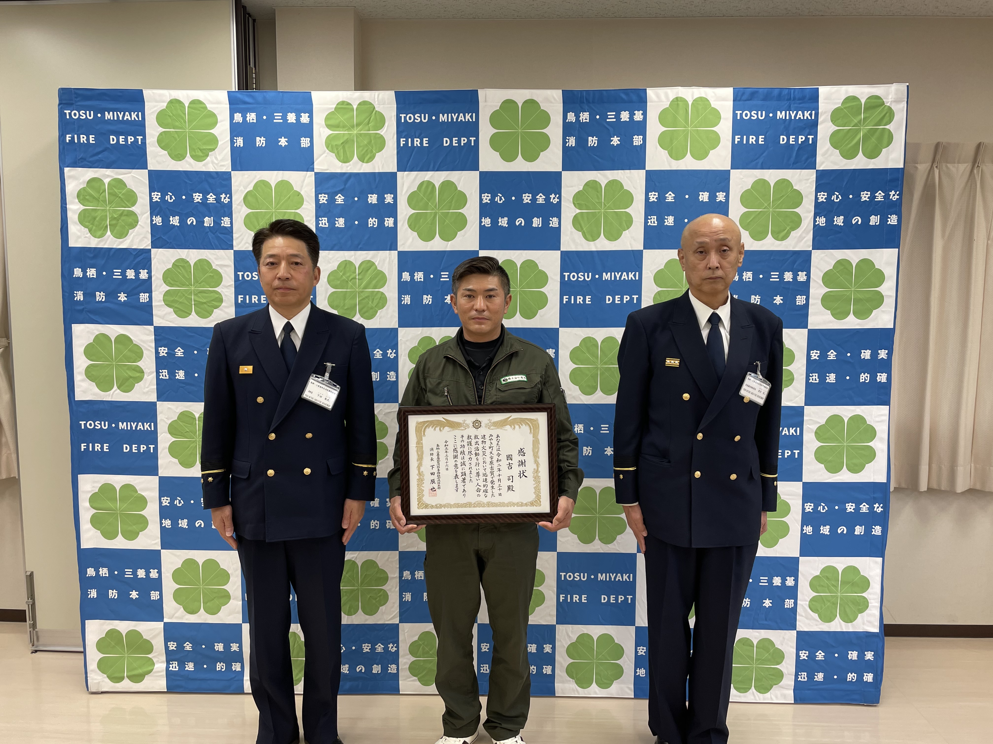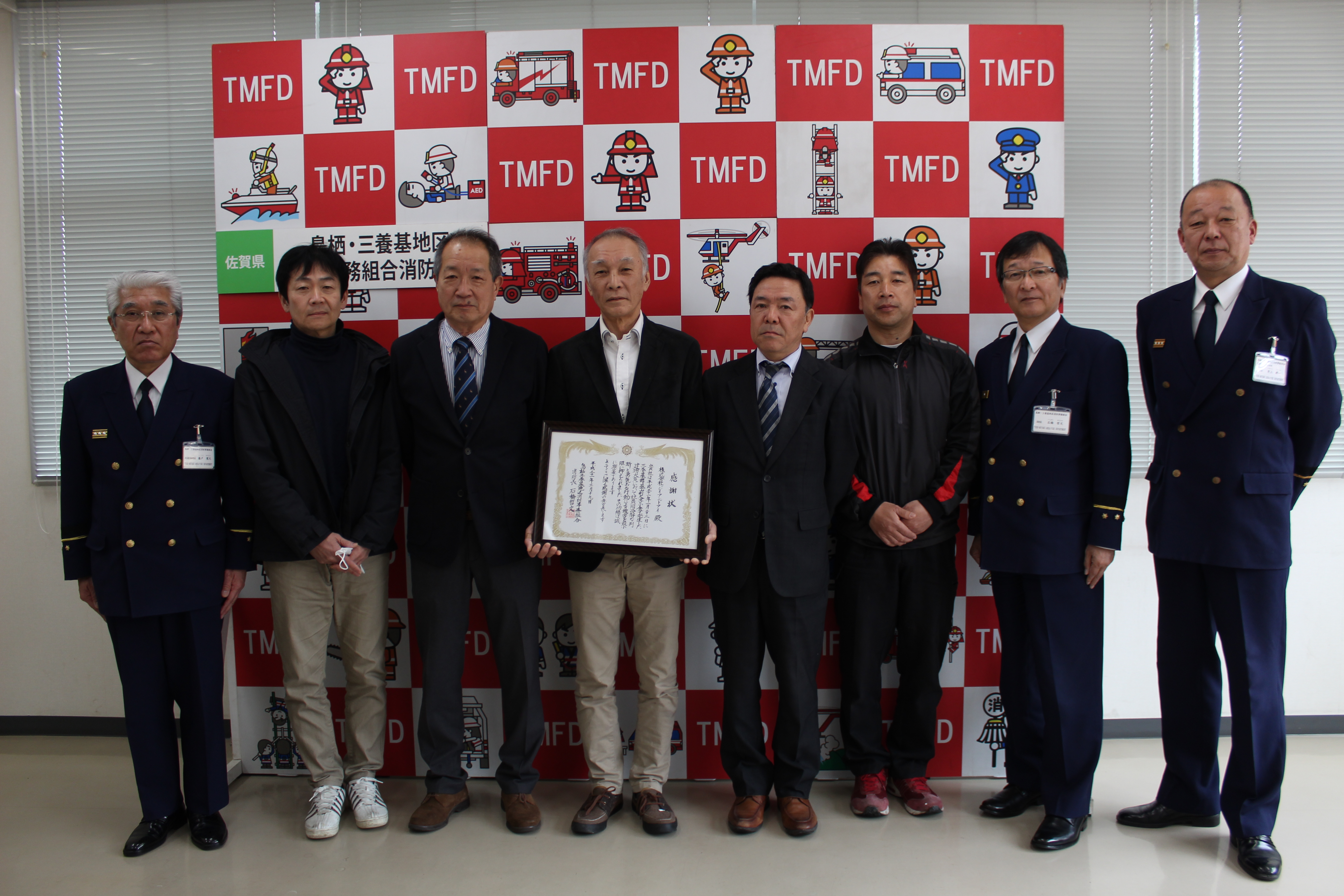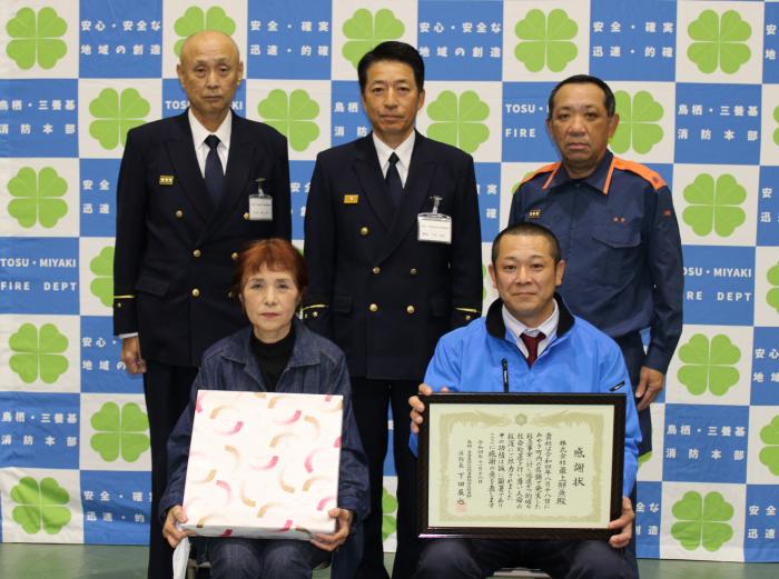 三養基郡基山町内で発生した建物火災で、迅速かつ適切な119番通報並びに初期消火及び排煙活動、住民の避難介助を行われました協力事業所に感謝状を贈呈しました。