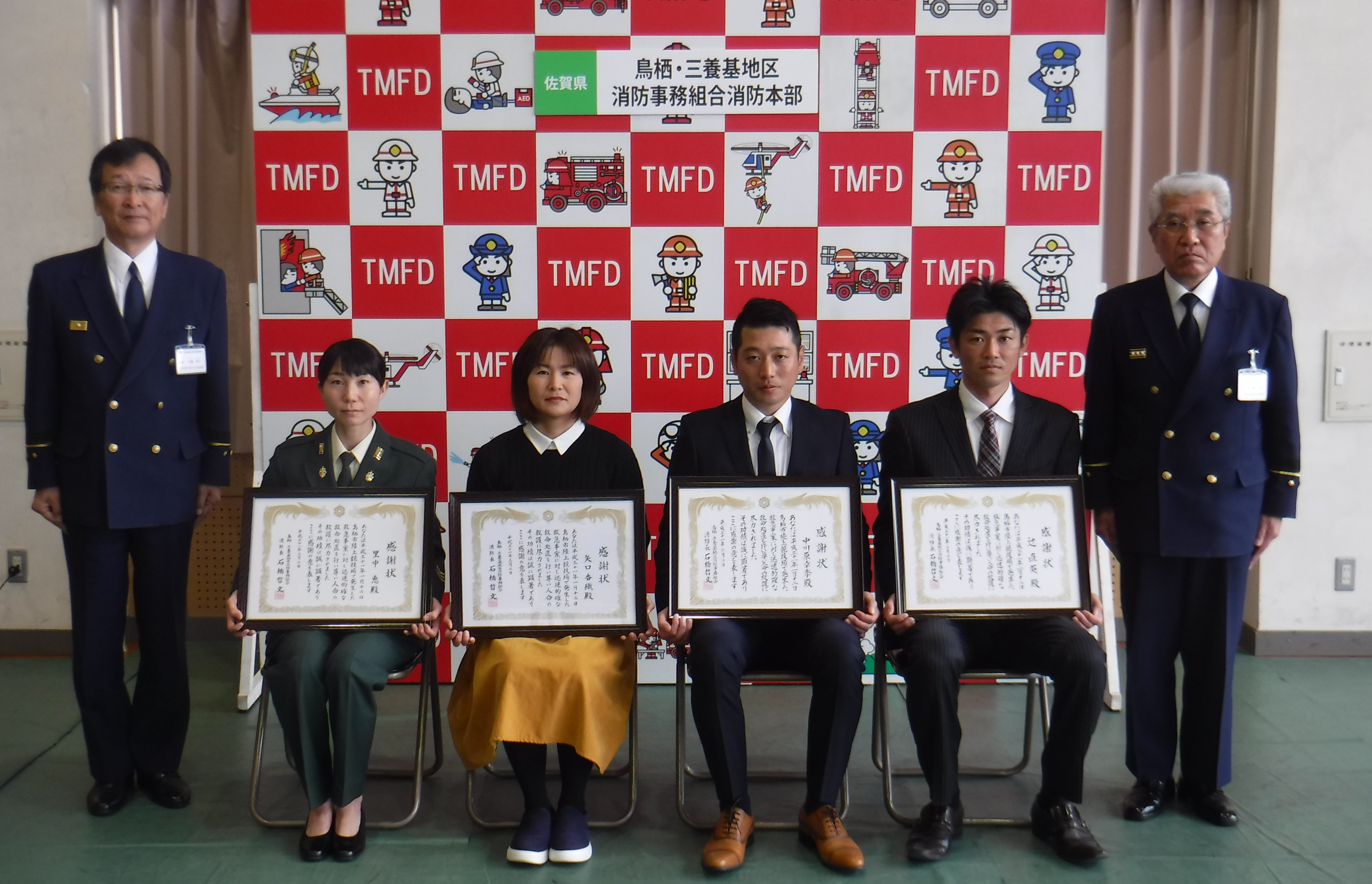 鳥栖市内で突然倒れた男性に対し、迅速かつ適切な観察により心肺停止と判断し、救急隊到着まで胸骨圧迫を行い傷病者の尊い命を救った事例として、平成31年3月2日(土)に感謝状を贈呈しました。