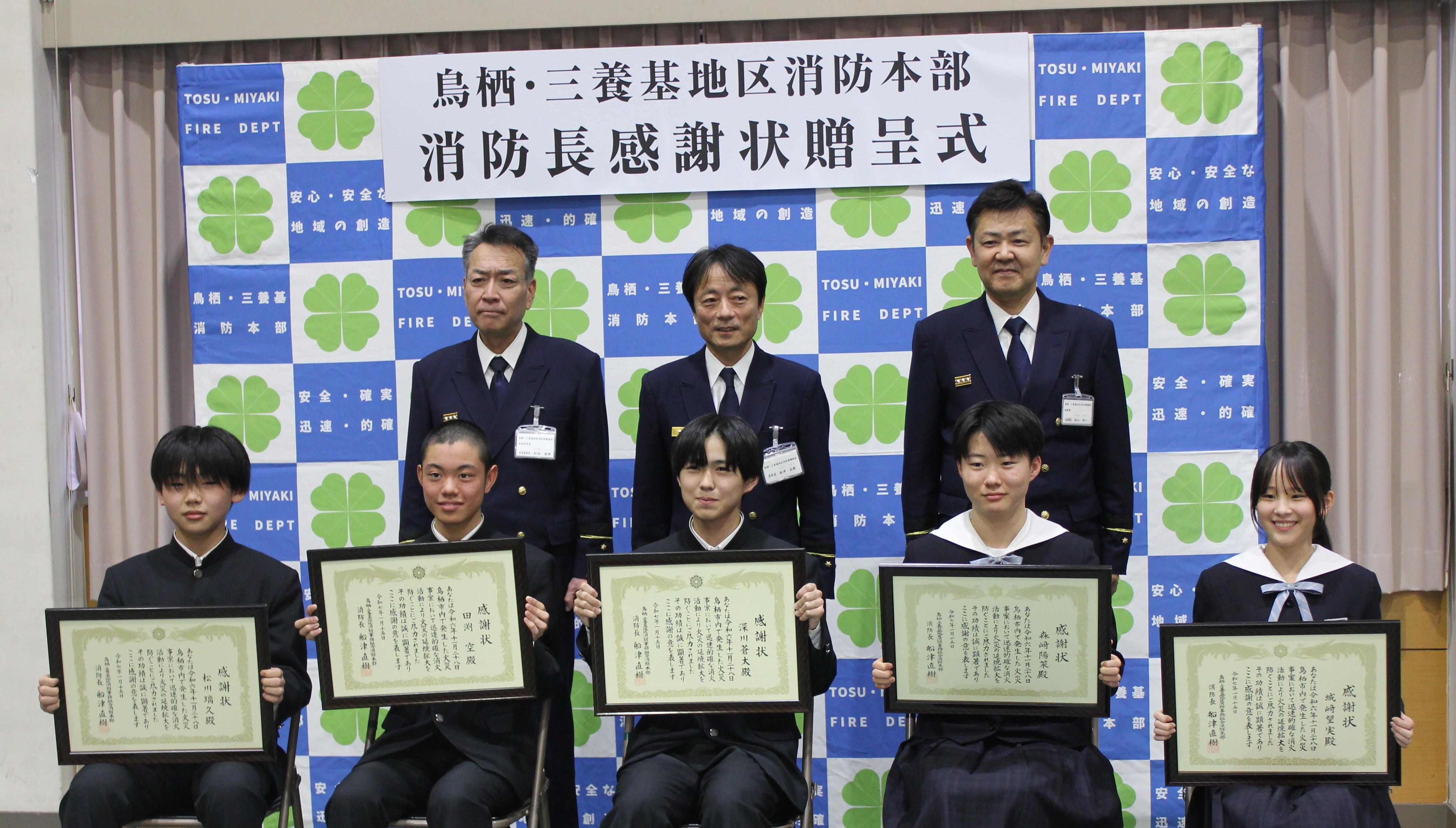 鳥栖市内で発生したその他火災において友人5人がバケツリレーでの初期消火に成功し、火災の延焼拡大を未然に防ぐことが出来ました。勇気を持った行動と見事なチームプレーで初期消火をしていただいた香楠中学校3年生5名に対して令和7年1月15日(水)に感謝状を贈呈しました。