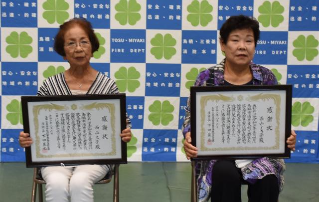 自転車で走行していた男性が農業用水路に転落し、顔を水に浸けたまま意識を失ったのを目撃し、二人は高さ約2mののり面を滑り降りて、用水路の中に入りうつぶせになった男性を抱きかかえ、119番通報後も救急隊が到着するまでの間、男性の体を支え続けました。