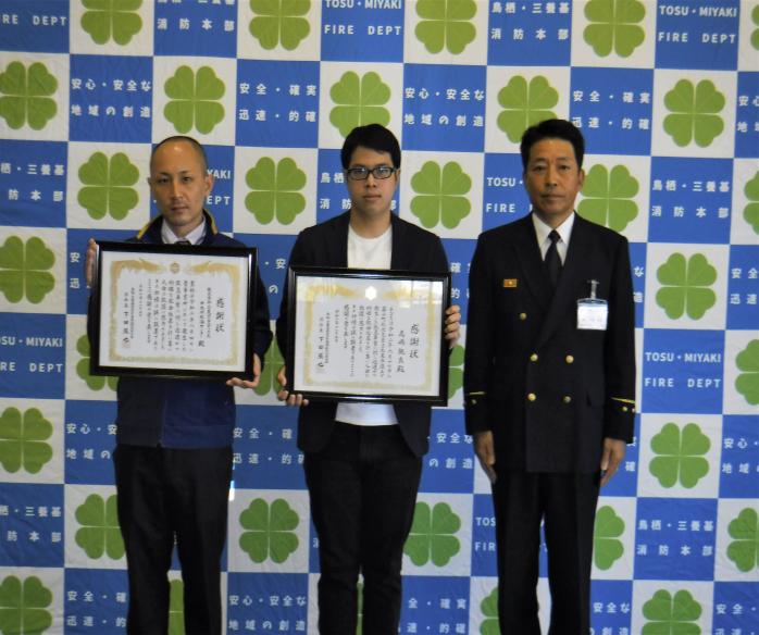 鳥栖市内で農業用水路に転落した男性を救助した二人に感謝状を贈呈しました。