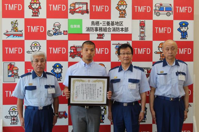 三養基郡みやき町内で突然倒れた男性に対し、迅速かつ適切な観察により心肺停止と判断し救急隊到着まで胸骨圧迫を行い傷病者の尊い命を救った事例として、平成30年6月16日(土)に感謝状を贈呈しました。